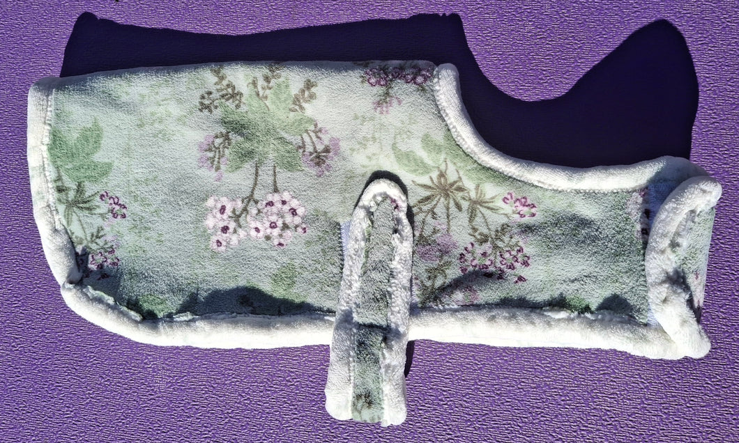 X-Large 13" back measurement with a deep chest and longer strap. These jackets are made from blankets or blanket material. Fuzzy and soft, inside and out. Machine wash & dry.