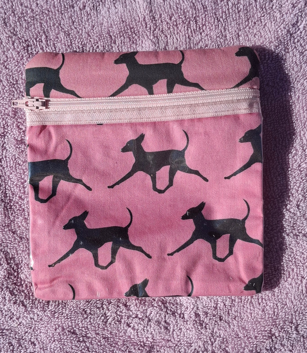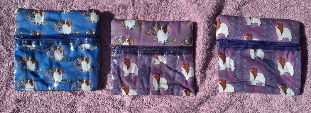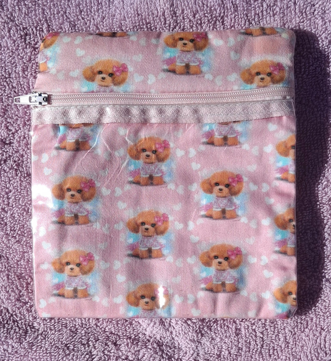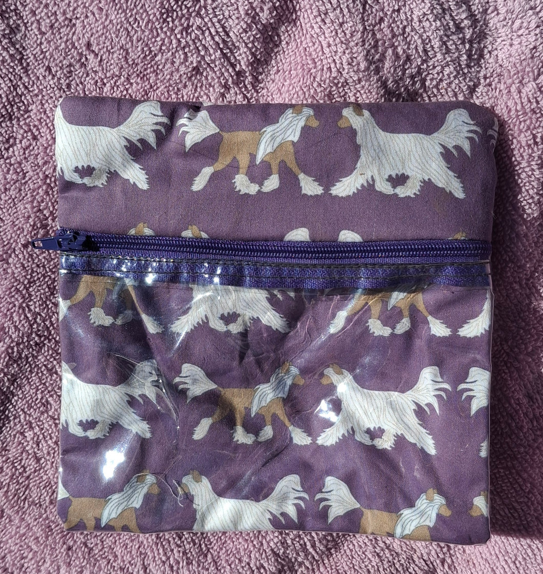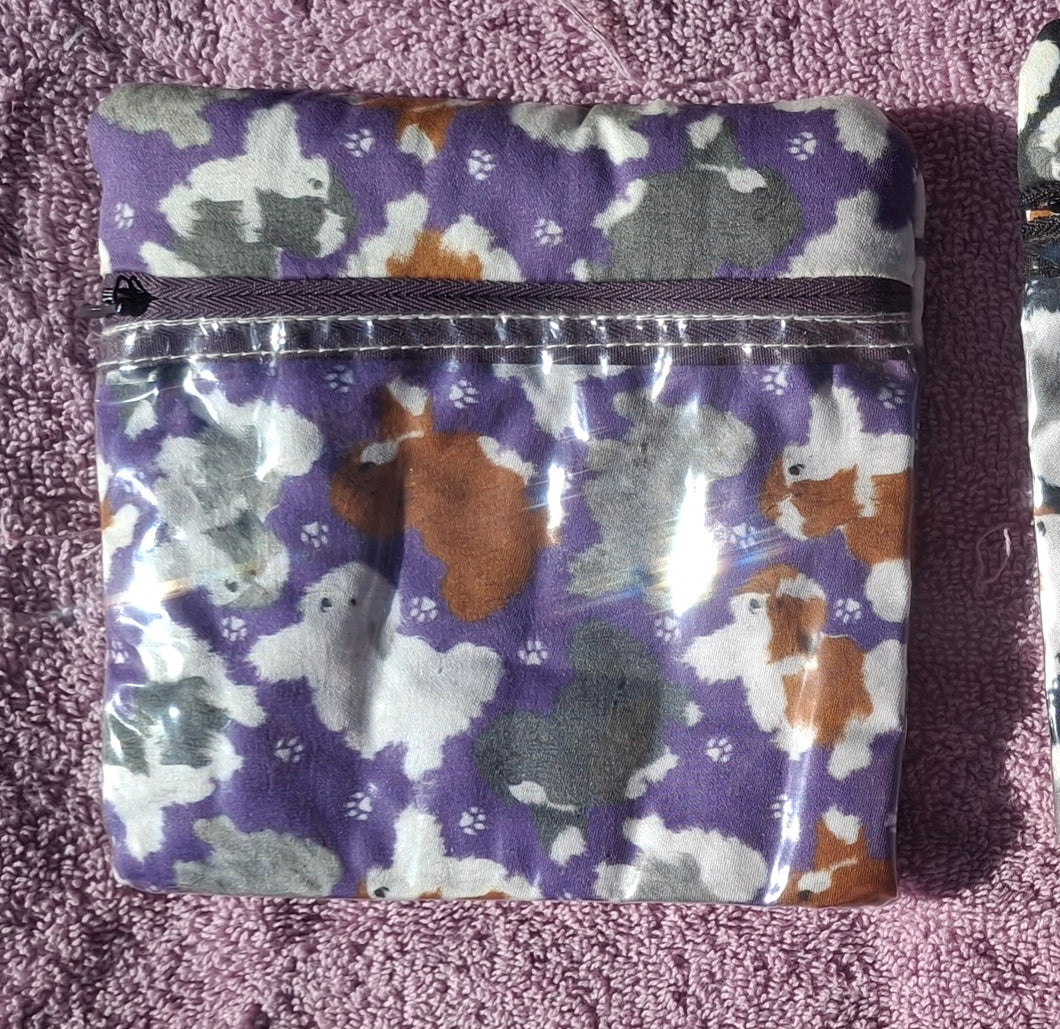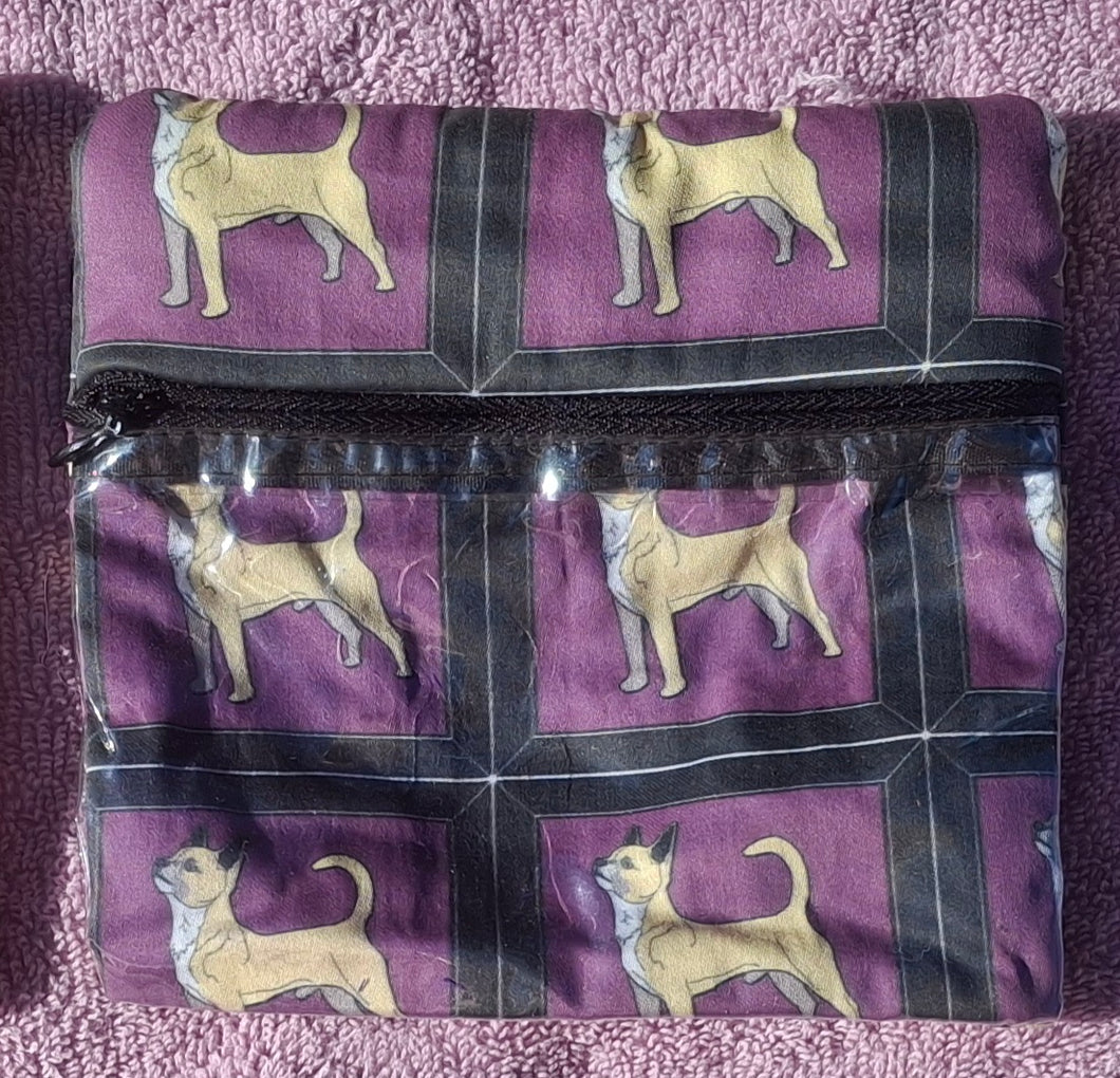 Leash bags! Approx 6" x 6". Front is clear so you can see contents. Great for leashes, make-up, money, etc. 100% cotton. Lightly padded to protect contents. Zip closure. Washable.