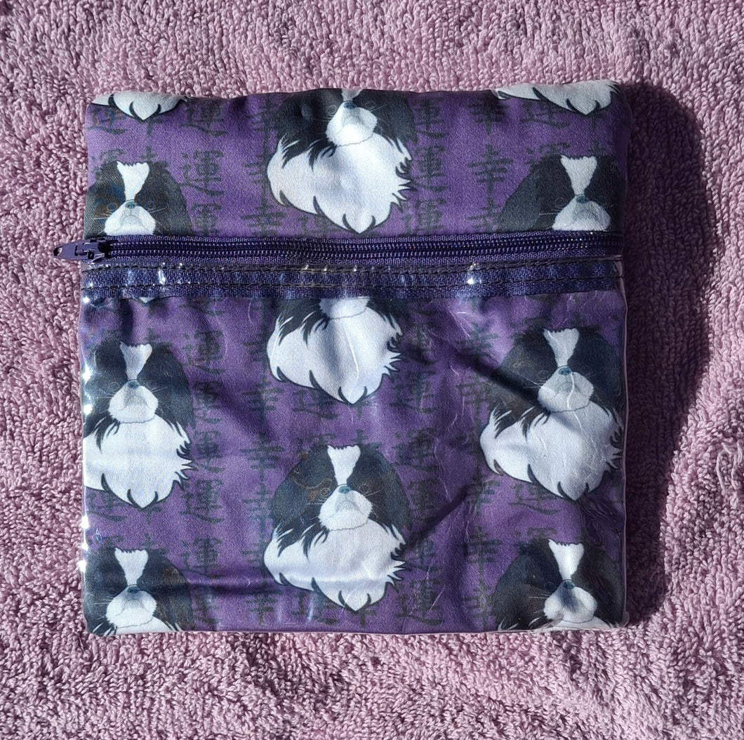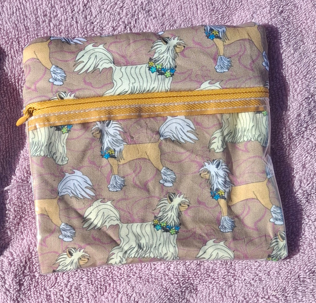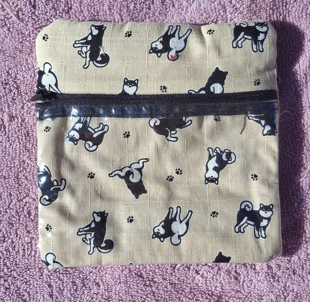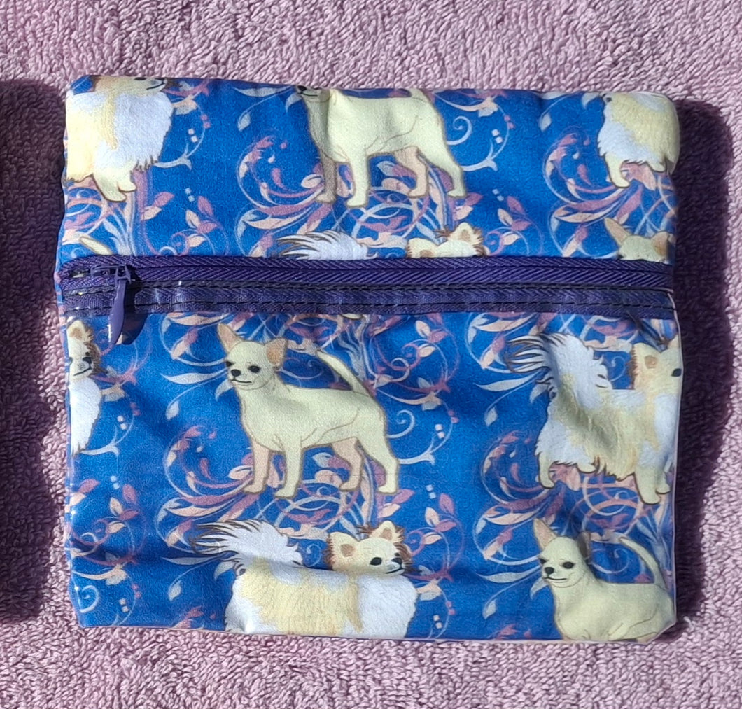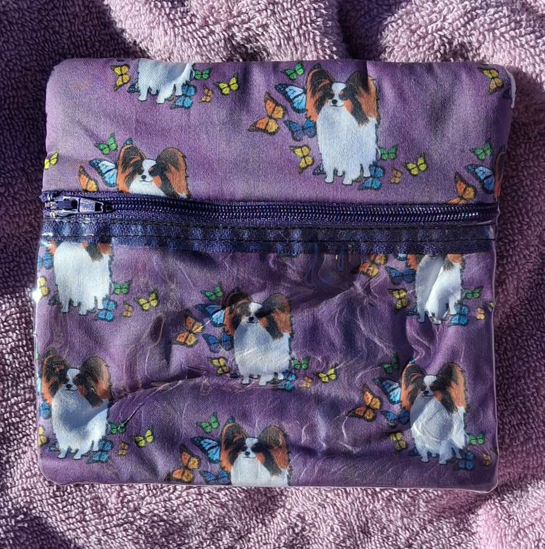 Leash bags! Approx 6" x 6". Front is clear so you can see contents. Great for leashes, make-up, money, etc. 100% cotton. Lightly padded to protect contents. Zip closure. Washable.