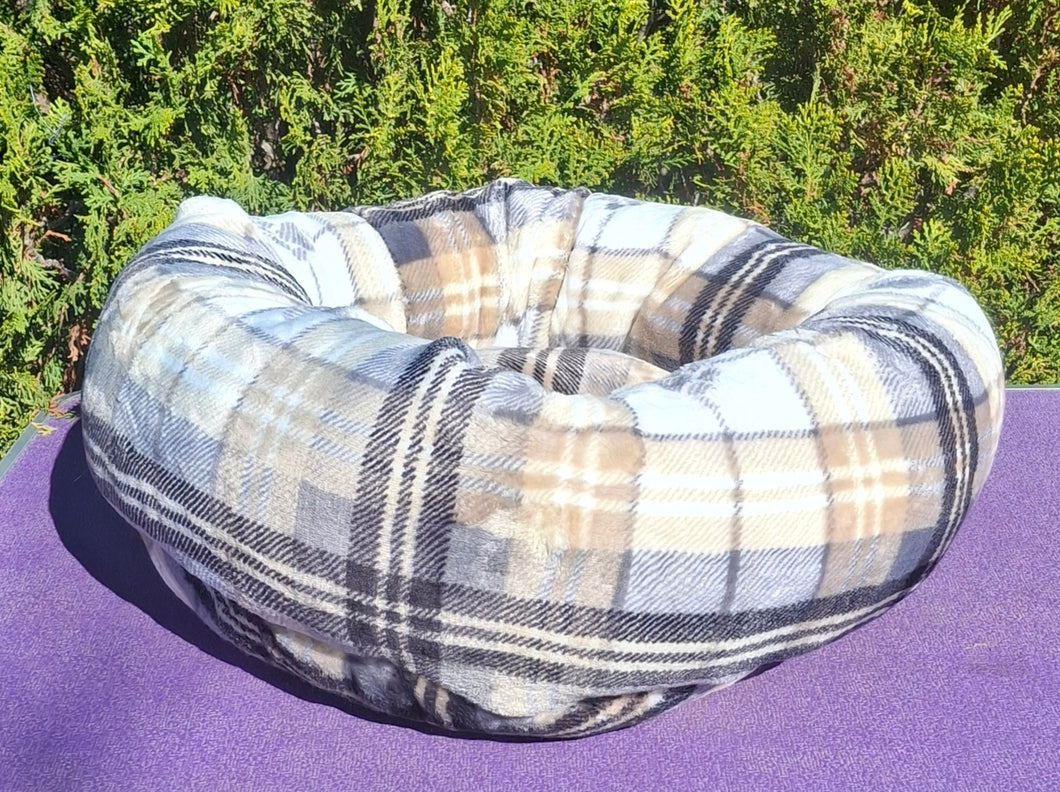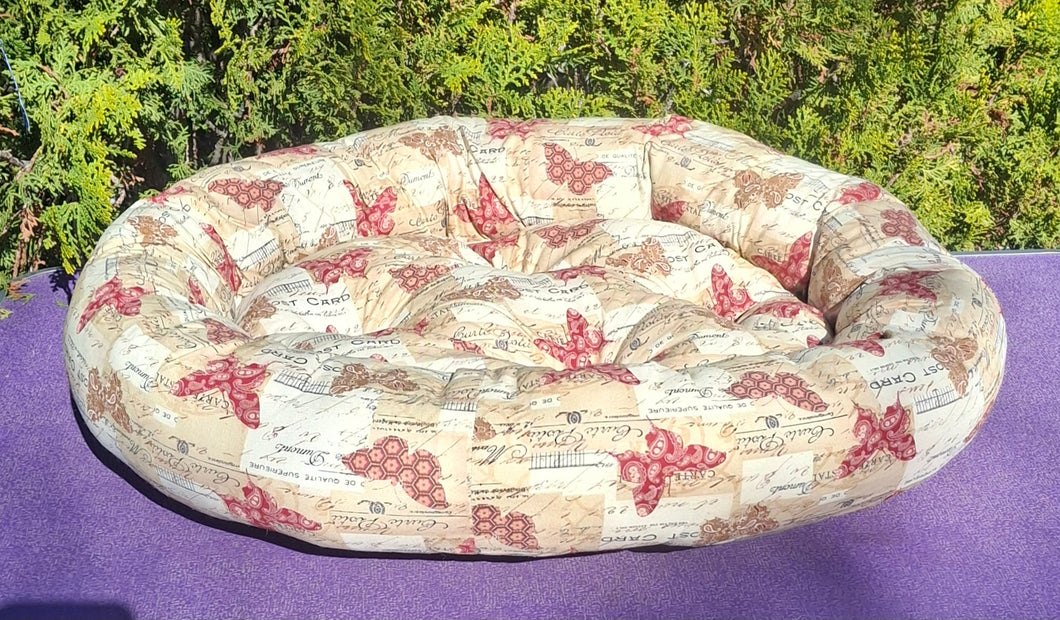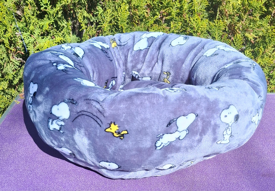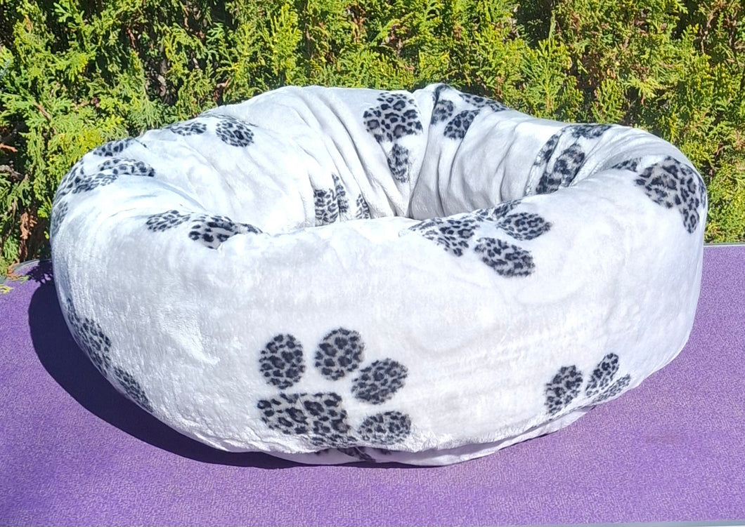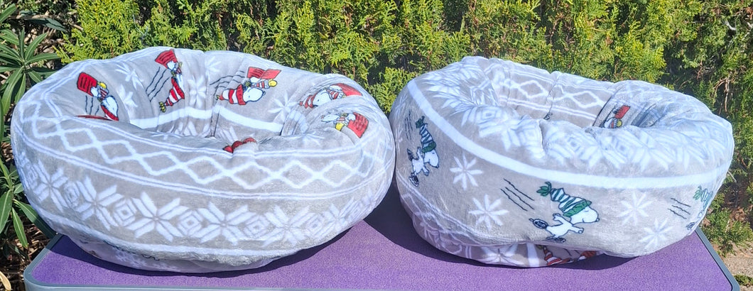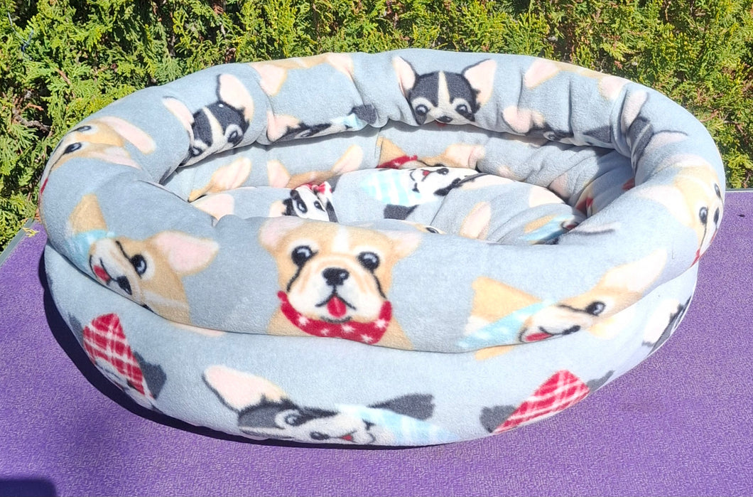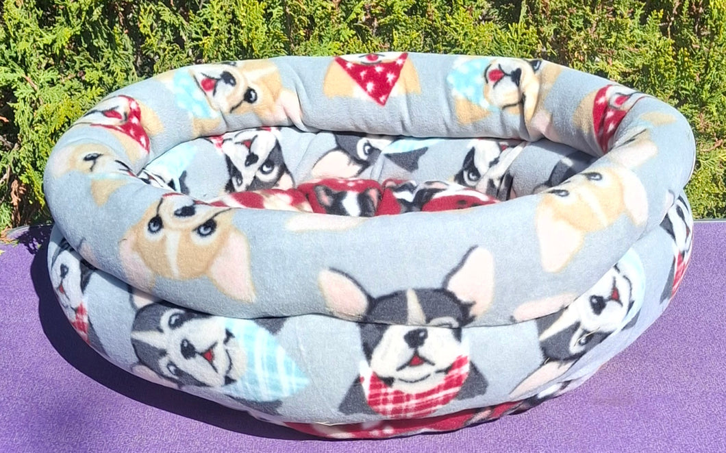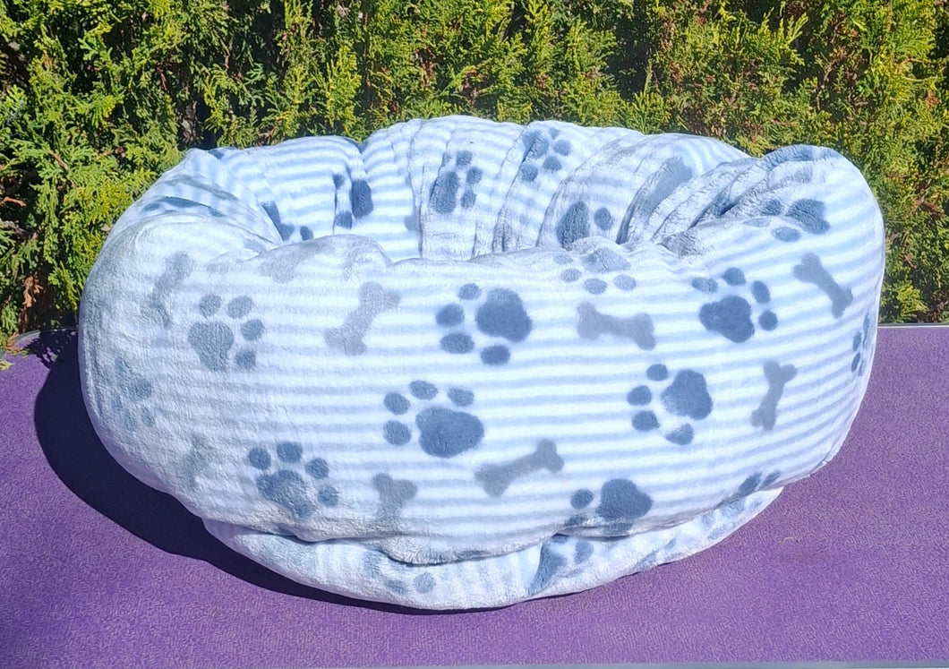 Fleece or Blanket or cotton sewn with cord for durability. Approximately 16 inside, 22" across outside.