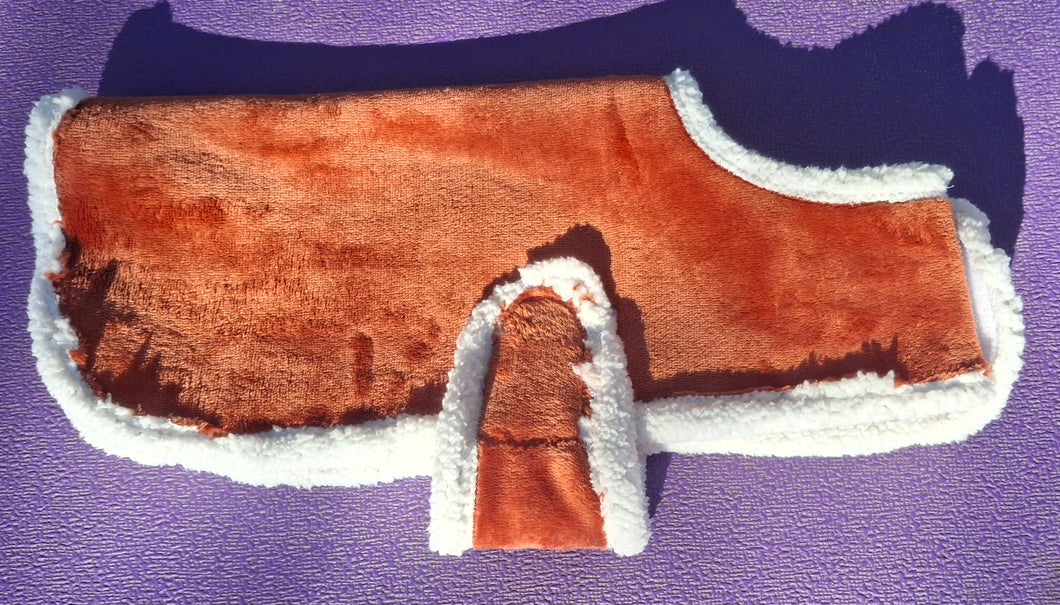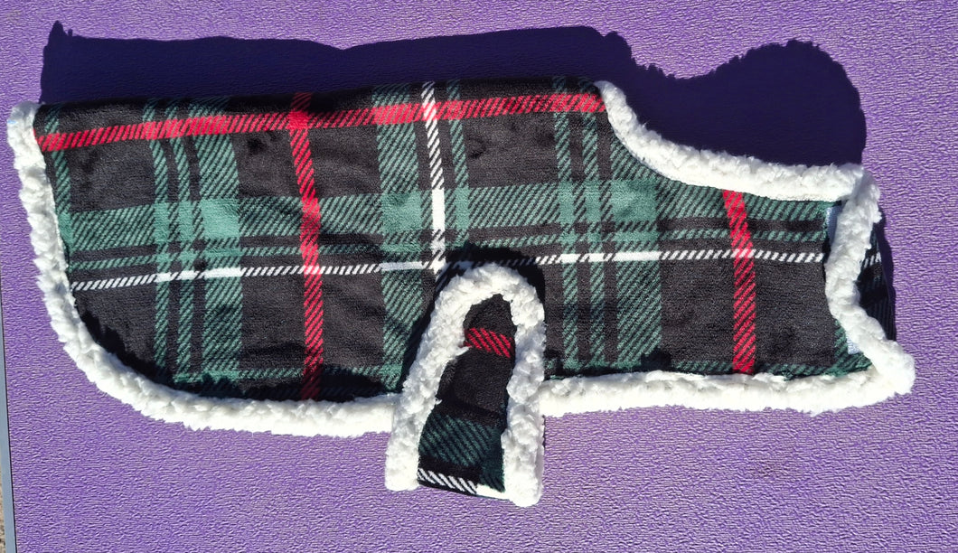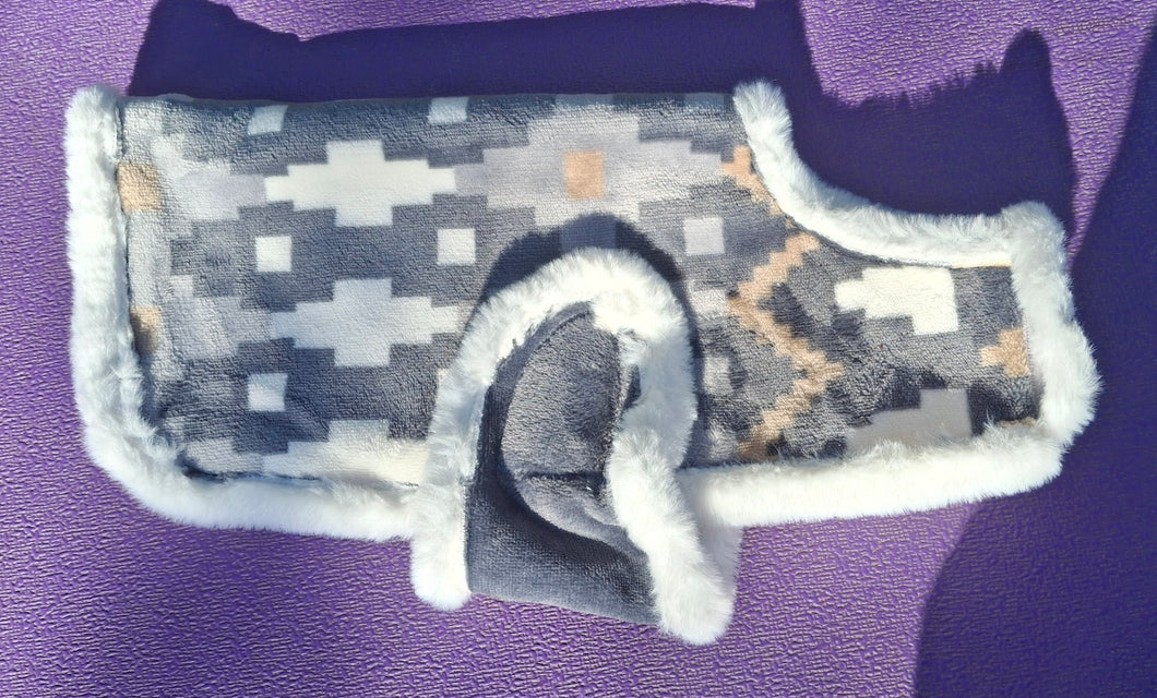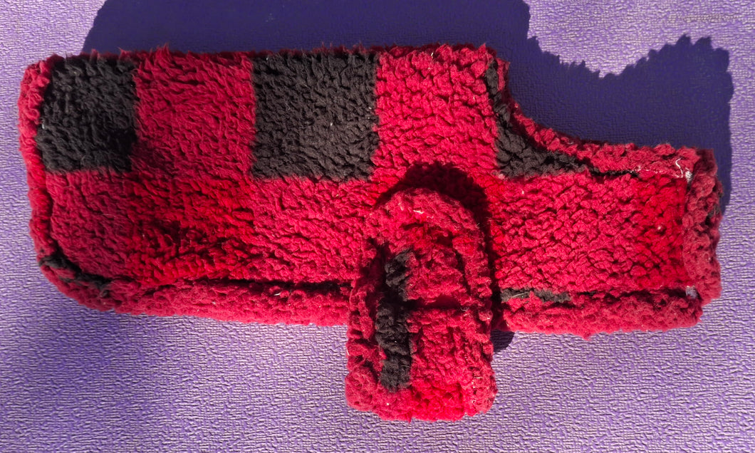 Medium 11-12" back measurement. These jackets are made from blankets or blanket material. Fuzzy and soft, inside and out. Machine wash & dry.