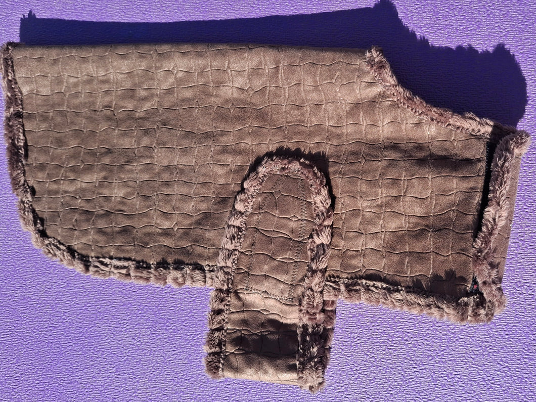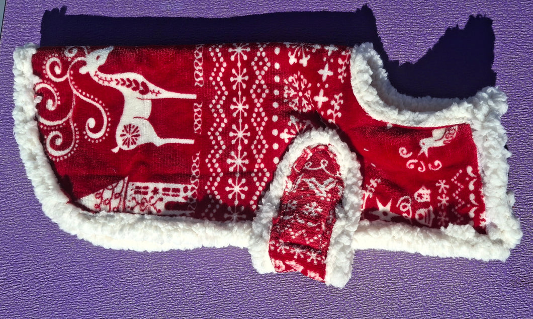 Large 15" back measurement. These jackets are made from blankets or blanket material. Fuzzy and soft, inside and out. Machine wash & dry.