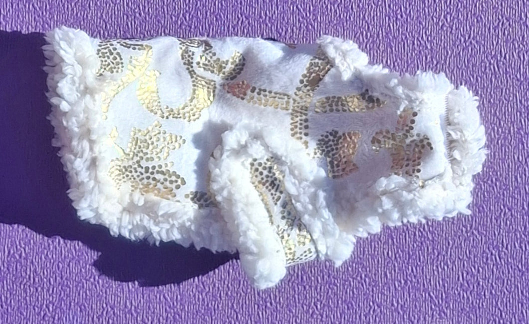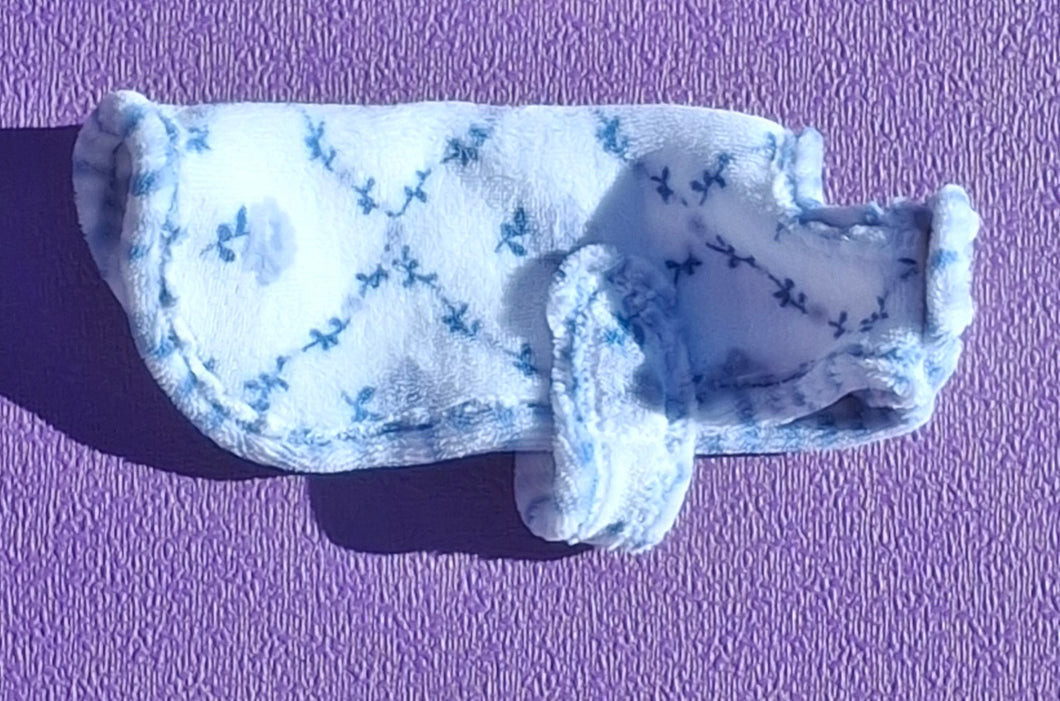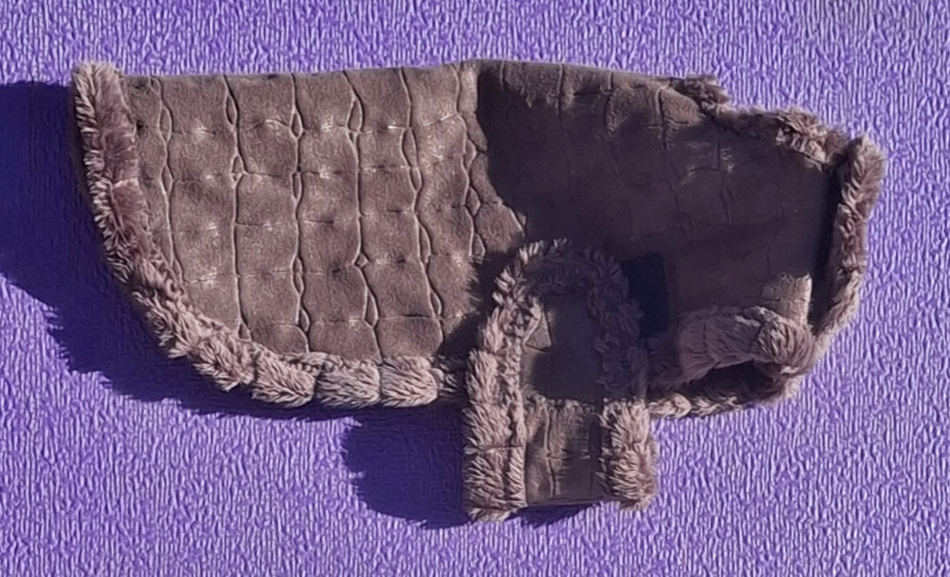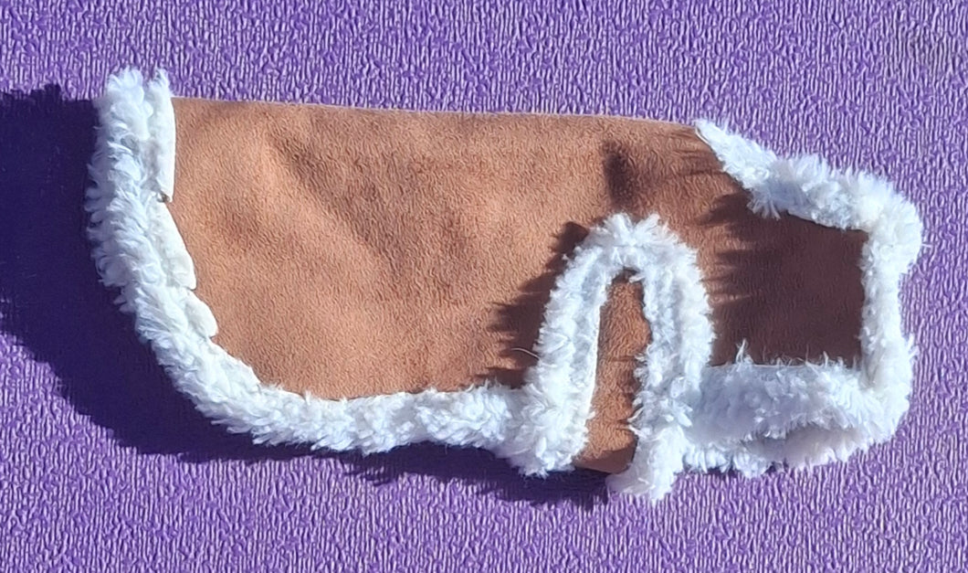 X-sm 7-8" back measurement. These jackets are made from blankets or blanket material. Fuzzy and soft, inside and out. Machine wash & dry.